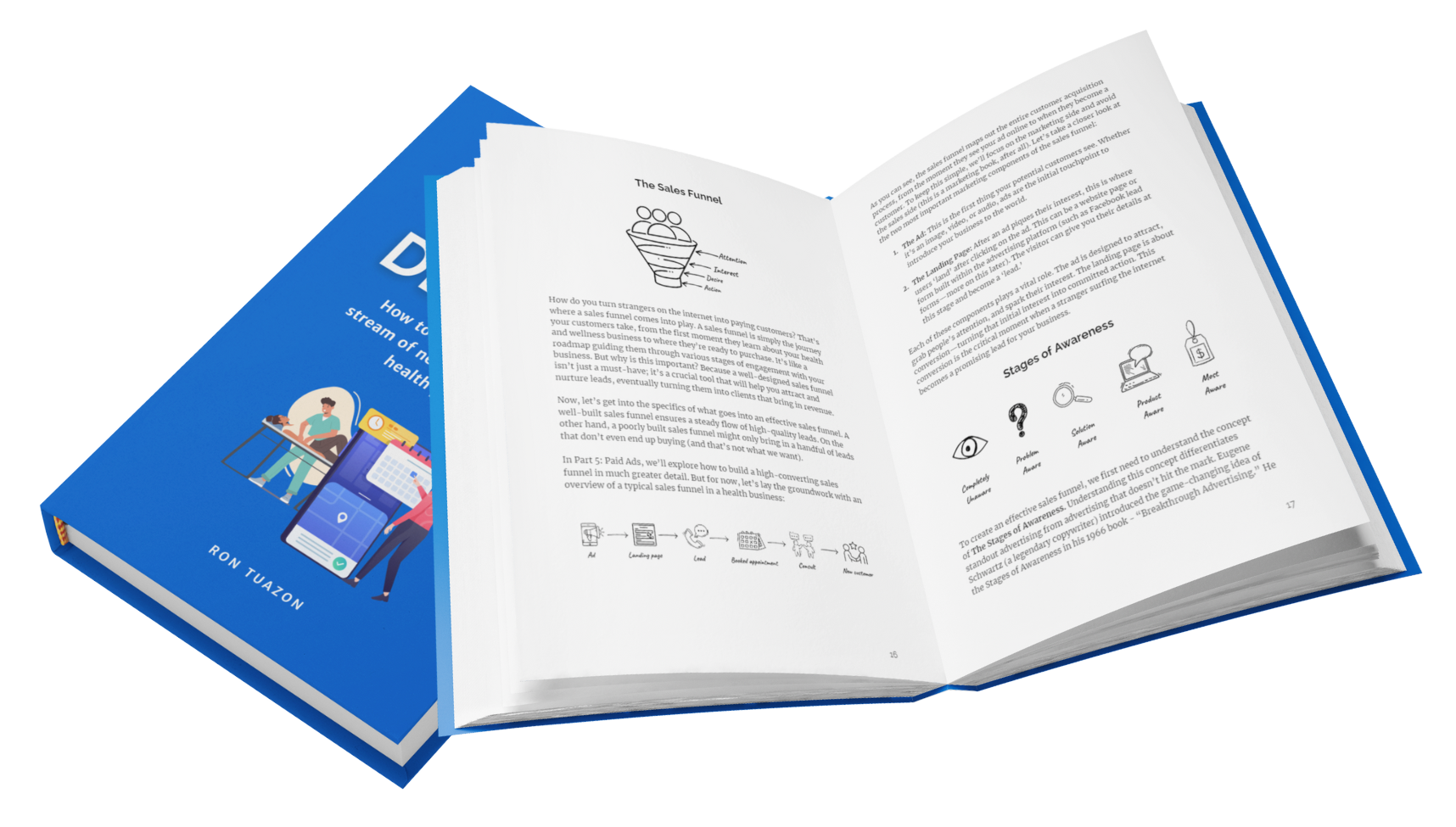 You’re getting a PDF copy of the book, which includes 5 parts and 150+ pages about the ‘secret lead generation system.’ When you buy the ebook, you also get exclusive access to our private community of health clinic owners.